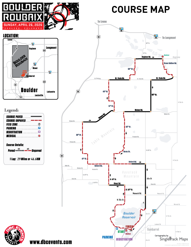 An new, longer 29 mile (46.6k) loop with 40% paved roads & 60% unpaved roads in North Boulder County. We’ve expanded the course to move the start finish to the Boulder Reservoir. The new course offers a challenging last few miles across the Boulder Reservoir dams. Rolling terrain on roads that can be anywhere from smooth to extremely rutted. It all depends on the weather running up to the race. If it is wet on race day, expect slippery, sloppy conditions on the dirt sections. Neutral support is based on volunteer availability and is unlikely. Please bring a pump and spare tube. Do a “bolt check” and bottle cage press.
